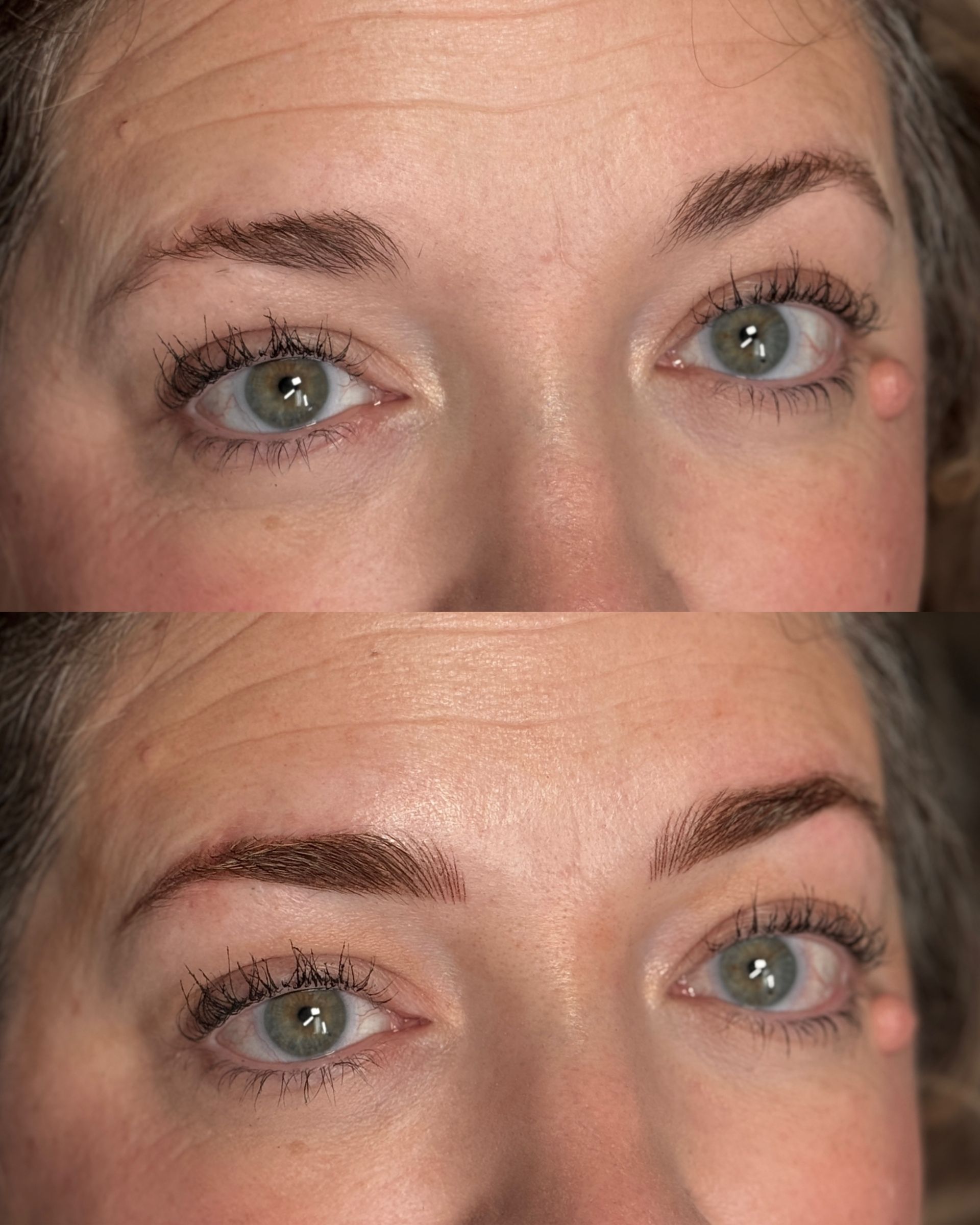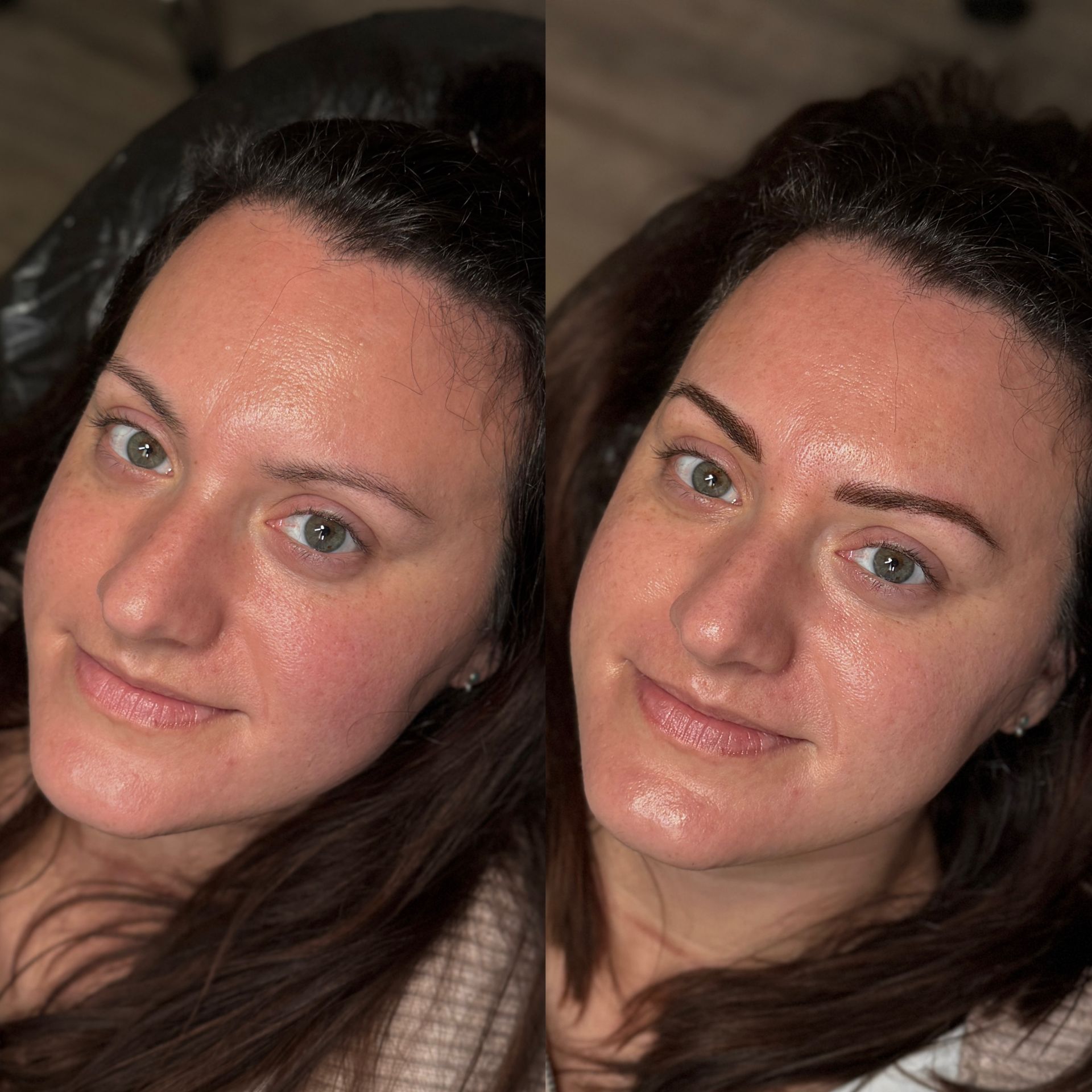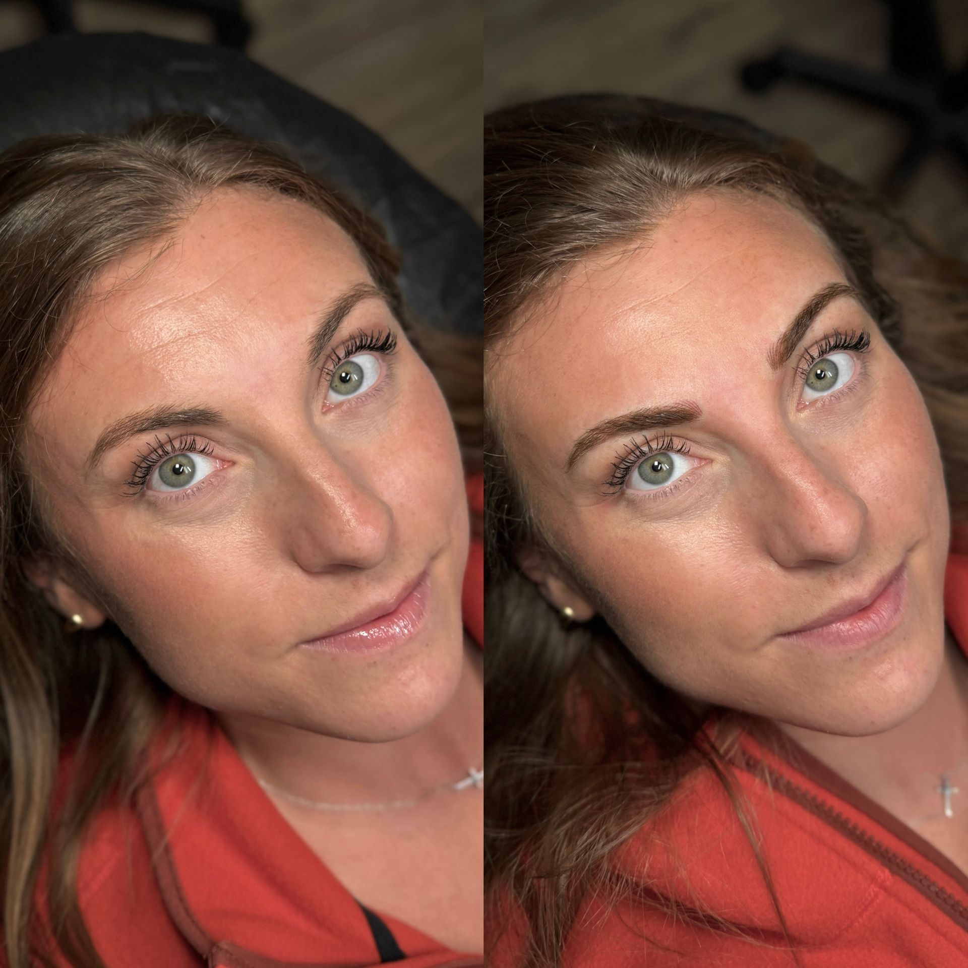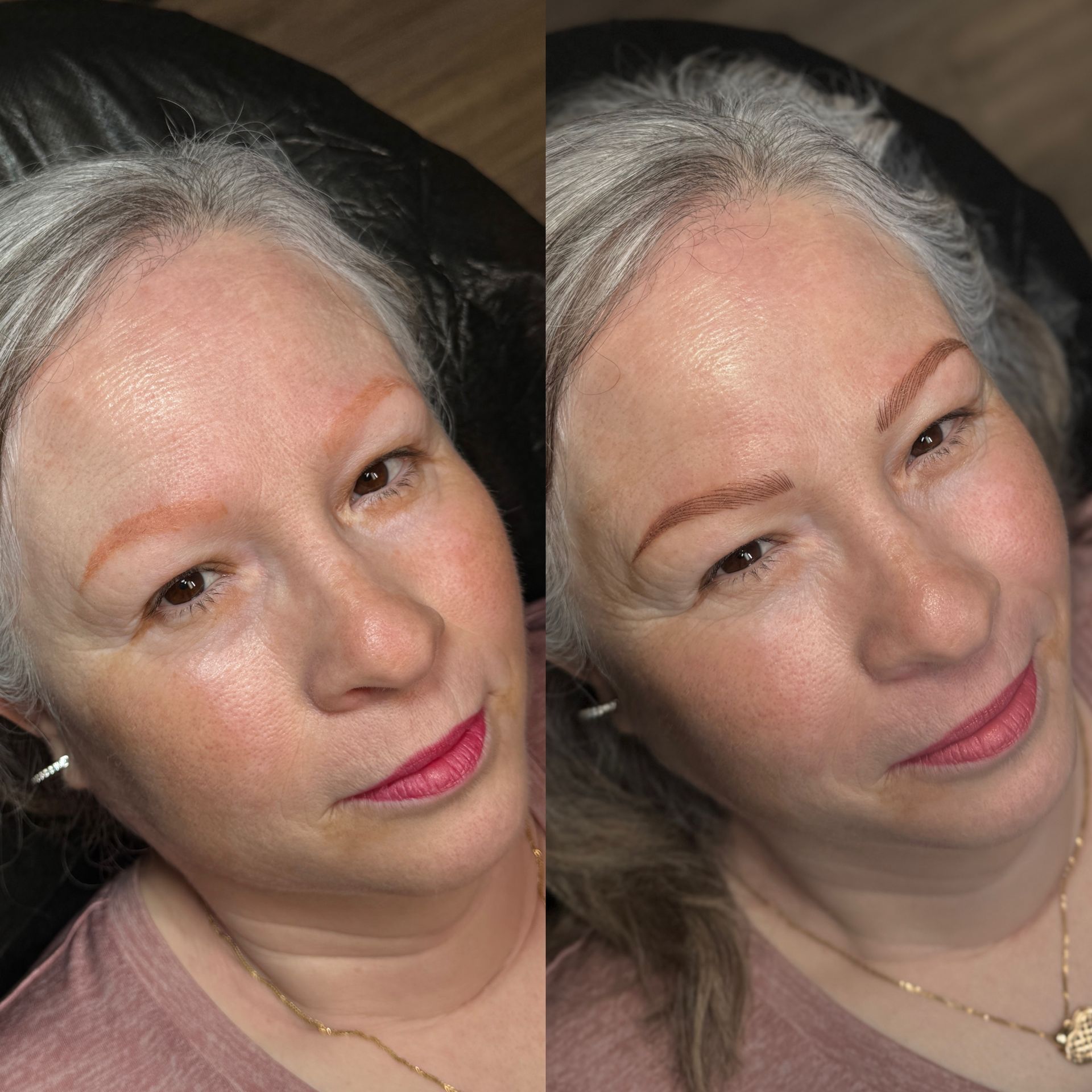 Combo Brows are a combination of hairstrokes and machine shading to give a natural, but defined eyebrow. This is best for clients with any skin type, or clients wanting natural brows but have sparse/patchy hair and need shading to blend with natural hair or those looking for something slightly fuller and more defined than hairstrokes alone. Typically hairstrokes are made mostly towards the fronts of the brows and shading is done through the middle/tails.